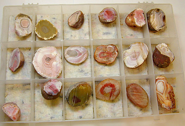 A nice colourful diplay of polished agate pieces from Ennis' Collection