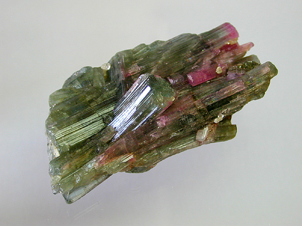 small pink and green tourmaline from Aracuai, Minas Gerais, Brazil. Two remarkable Tricoloured Tourmaline crystals from the well documented Sapo Mine, Minas Gerais, Brazil.